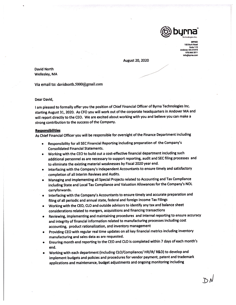 Byrna Technologies Inc.OFFICE lOOBumRoad Sulte115 Andover, MA 01810 978.868.5011 lnfO@byma.com August 20, 2020David North Wellesley, MAVia email to: davidnorth.5000@gmail.comDear David,I am pleased to formally offer you the position of Chief Financial Officer of Byrna Technologies Inc. starting August 31, 2020. As CFO you will work out of the corporate headquarters in Andover MA and will report directly to the CEO. We are excited about working with you and believe you can make a strong contribution to the success of the Company. Responsibilities As Chief Financial Officer you will be responsible for oversight of the Finance Department including• Responsibility for all SEC Financial Reporting including preparation of the Company's Consolidated Financial Statements. • Working with the CEO to build out a cost-effective financial department including such additional personnel as are necessary to support reporting, audit and SEC filing processes and to eliminate the existing material weaknesses by Fiscal 2020 year end. • Interfacing with the Company's Independent Accountants to ensure timely and satisfactory completion of all Interim Reviews and Audits. • Managing and Implementing all Special Projects related to Accounting and Tax Compliance including State and Local Tax Compliance and Valuation Allowances for the Company's NOL carryforwards. • Interfacing with the Company's Accountants to ensure timely and accurate preparation and filing of all periodic and annual state, federal and foreign Income Tax Filings • Working with the CEO, CLO and outside advisors to identify any tax and balance sheet considerations related to mergers, acquisitions and financing transactions • Reviewing, implementing and maintaining procedures and internal reporting to ensure accuracy and integrity of financial information related to manufacturing processes including cost accounting, product rationalization, and inventory management • Providing CEO with regular real time updates on all key financial metrics including inventory manufacturing and sales data as are requested. • Ensuring month end reporting to the CEO and CLO is completed within 7 days of each month's end. • Working with each department (including CLO/Compliance/ HR/IR/ R&D) to develop and implement budgets and policies and procedures for vendor payment, patent and trademark applications and maintenance, budget adjustments and ongoing monitoring including