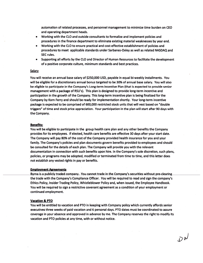 automation of related processes, and personnel management to minimize time burden on CEO and operating department heads. • Working with the CLO and outside consultants to formalize and implement policies and procedures in the finance department to eliminate existing material weaknesses by year end. • Working with the CLO to ensure practical and cost-effective establishment of policies and procedures to meet applicable standards under Sarbanes-Oxley as well as related NASDAQ and SEC rules. • Supporting all efforts by the CLO and Director of Human Resources to facilitate the development of a positive corporate culture, minimum standards and best practices. You will receive an annual base salary of $250,000 USD, payable in equal bi-weekly installments. You will be eligible for a discretionary annual bonus targeted to be 30% of annual base salary. You will also be eligible to participate in the Company's Long-term Incentive Plan (that is expected to provide senior management with a package of RSU's ). This plan is designed to provide long-term incentive and participation in the growth of the Company. This long-term incentive plan is being finalized for the Company by Korn Ferry and should be ready for implementation shortly. Your long-term incentive package is expected to be comprised of 600,000 restricted stock units that will vest based on "double triggers" of time and stock price appreciation . Your participation in the plan will start after 90 days with the Company. Benefits: You will be eligible to participate in the group health care plan and any other benefits the Company provides for its employees. If elected, health care benefits are effective 30 days after your start date. The Company will pay 80% of the cost of the Company provided health insurance for you and your family. The Company's policies and plan documents govern benefits provided to employees and should be consulted for the details of each plan. The Company will provide you with the relevant documentation in connection with such benefits upon hire. In the Company's sole discretion, such plans, policies, or programs may be adopted, modified or terminated from time to time, and this letter does not establish any vested rights in pay or benefits. Employment Agreements Byrna is a publicly traded company. You cannot trade in the Company's securities without pre-clearing the trade with the Company's Compliance Officer. You will be required to read and sign the company's Ethics Policy, Insider Trading Policy, Whistleblower Policy and, when issued, the Employee Handbook. You will be required to sign a restrictive covenant agreement as a condition of your employment or continued employment. vacation & PTO You will be entitled to vacation and PTO in keeping with Company policy which currently affords senior executives three weeks of paid vacation and 6 personal days. PTO dates must be coordinated to assure coverage in your absence and approved in advance by me. The Company reserves the right to modify its vacation and PTO policies at any time, with or without notice.