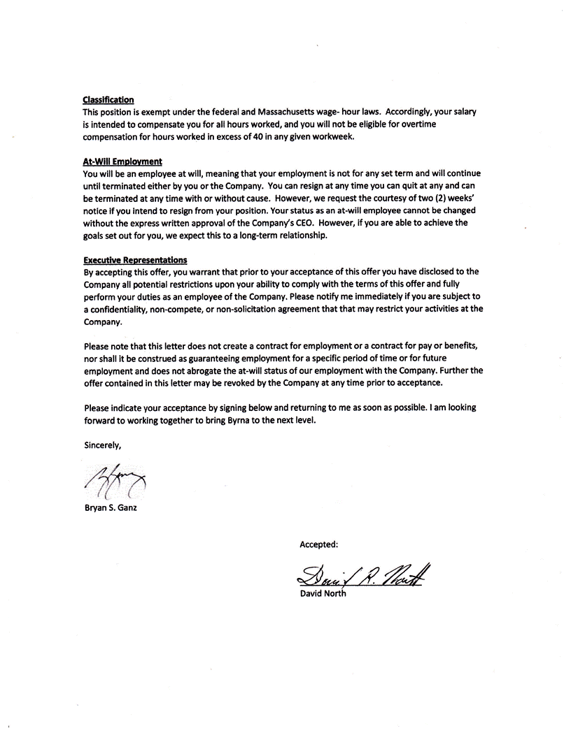 Classification This position is exempt under the federal and Massachusetts wage- hour laws. Accordingly, your salary is intended to compensate you for all hours worked, and you will not be eligible for overtime compensation for hours worked in excess of 40 in any given workweek. At-Will Employment You will be an employee at will, meaning that your employment is not for any set term and will continue until terminated either by you or the Company. You can resign at any time you can quit at any and can be terminated at any time with or without cause. However, we request the courtesy of two (2) weeks' notice if you intend to resign from your position. Your status as an at-will employee cannot be changed without the express written approval of the Company's CEO. However, if you are able to achieve the goals set out for you, we expect this to a long-term relationship. Executive Representations By accepting this offer, you warrant that prior to your acceptance of this offer you have disclosed to the Company all potential restrictions upon your ability to comply with the terms of this offer and fully perform your duties as an employee of the Company. Please notify me immediately if you are subject to a confidentiality, non-compete, or non-solicitation agreement that that may restrict your activities at the Company. Please note that this letter does not create a contract for employment or a contract for pay or benefits, nor shall it be construed as guaranteeing employment for a specific period of time or for future employment and does not abrogate the at-will status of our employment with the Company. Further the offer contained in this letter may be revoked by the Company at any time prior to acceptance. Please indicate your acceptance by signing below and returning to me as soon as pos ible. I am looking forward to working together to bring Byrna to the next level. Sincerely,Bryan S. Ganz Accepted:/s/ David North David North